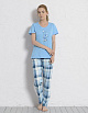 Женский домашний комплект состоит из футболки и брюк. Комплект выполнен из 100% натурального хлопка. Футболка имеет круглый вырез горловины и короткие рукава. Брюки свободного кроя снабжены резинкой на талии. Футболка выполнена в однотонном дизайне, а брюки дополнены принтом в клетку.