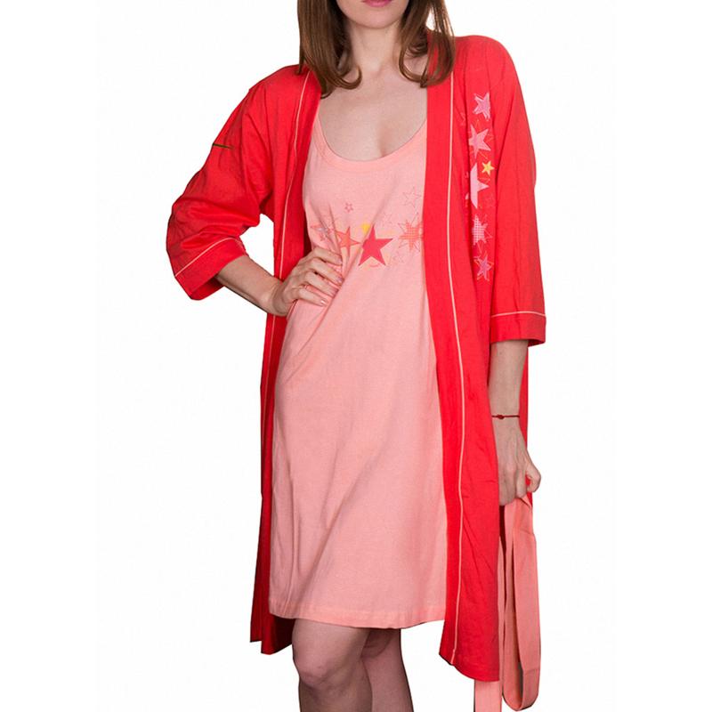 Комфортный домашний комплект из ночной сорочки и халата. Сорочка полуприталенного силуэта на бретелях, на груди украшена принтом. Халат с запахом и поясом, имеет рукава 3/4 и два накладных кармана. Комплект выполнен из 100% хлопка. Ткань обладает высокими гигиеническими характеристиками и не потеряет привлекательность внешнего вида даже после многочисленных циклов стирки.