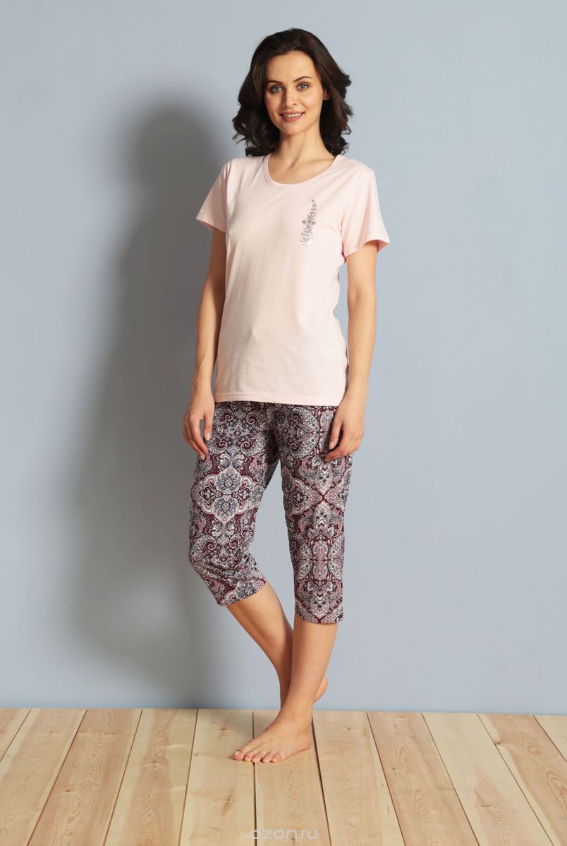 Женский домашний комплект включает футболку и капри. Комплект выполнен из 100% натурального хлопка. Футболка имеет круглый вырез горловины и короткие рукава. Капри снабжены резинкой на талии. Футболка выполнена в однотонном дизайне и украшена вышивкой, а капри дополнены оригинальным этническим принтом.