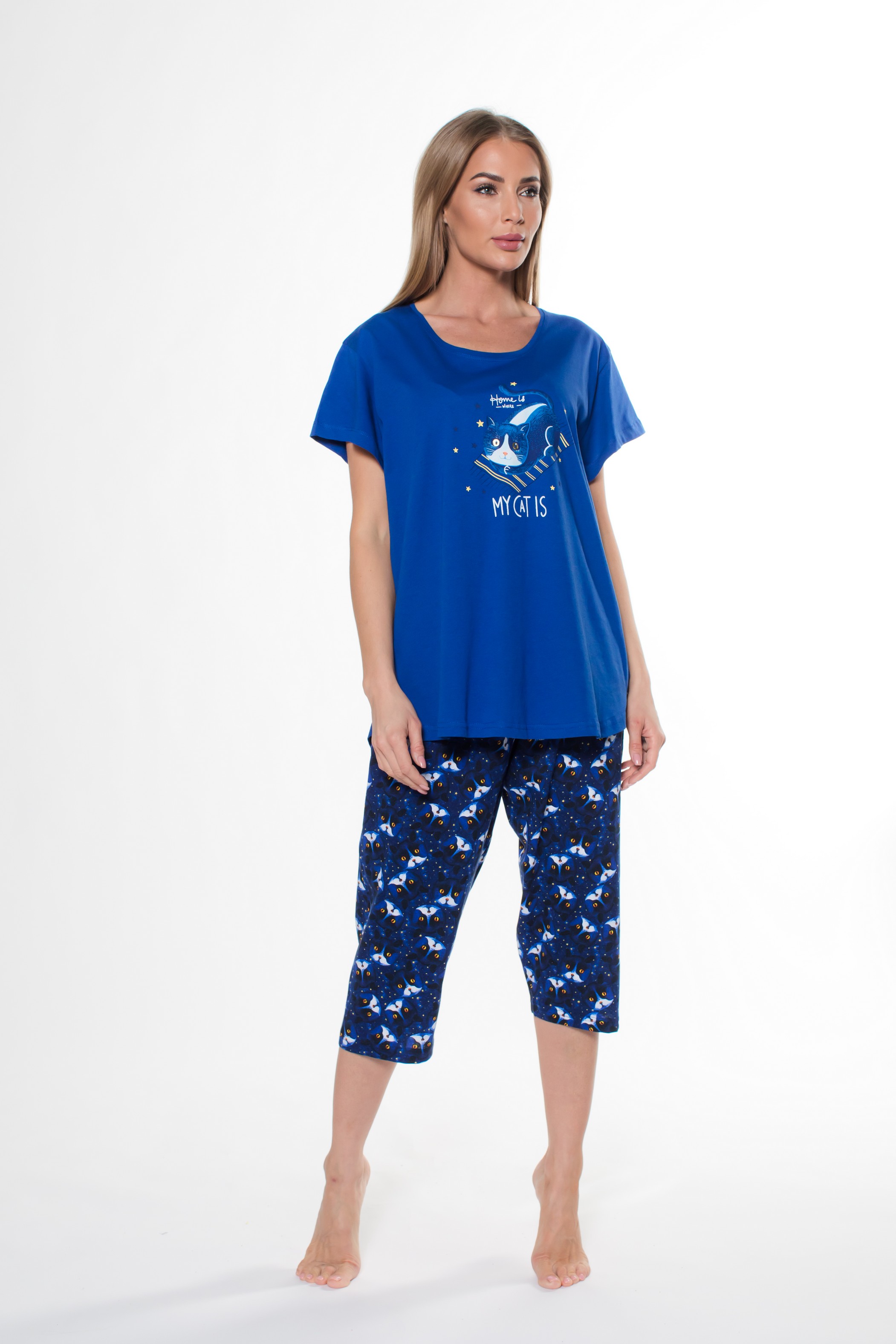 Женский домашний комплект прямого кроя в желтом (100% хлопок), сером (верх: 70% хлопок, 30% полиэстер; низ: 100% хлопок) и синем (100% хлопок) цветах. Футболка с классической круглой горловиной и коротким рукавом дополнена термоаппликацией в виде отдыхающей кошечки. Укороченные штаны капри с принтом в виде кошачьих мордочек держатся на резинке. Ткань дышащая, легкая, износостойкая и маломнущаяся, а также легко стирается.