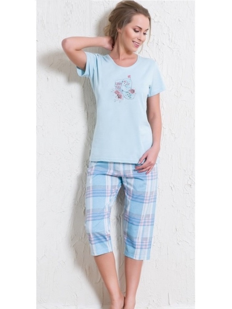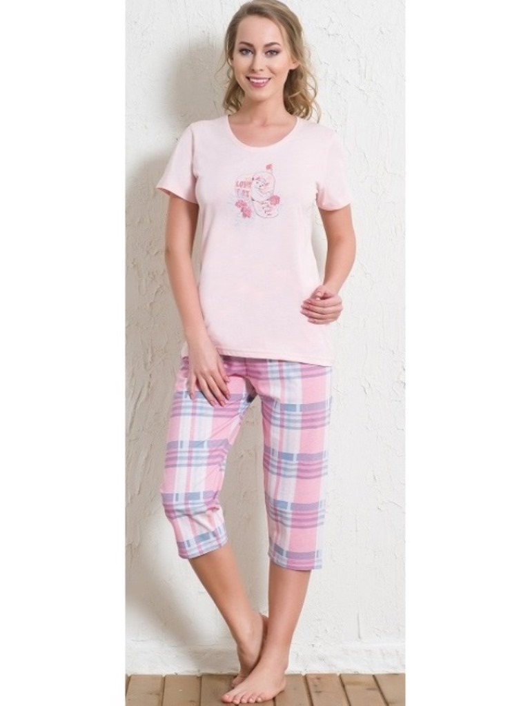 Домашний хлопковый комплект: футболка и бриджи. Футболка приталенного силуэта с круглым вырезом горловины, оформлена рисунком. Легкие бриджи с широкой резинкой на талии дополнительно завязываются на шнурок. Модель оформлена принтом.