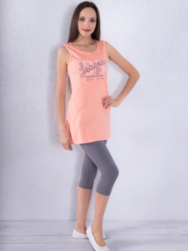 Домашний комплект из мягкого трикотажного полотна. Майка удлиненная, приталенная, расклешенная книзу. Капри на эластичном поясе. Отличный вариант для дома, сна и отдыха на каждый день.