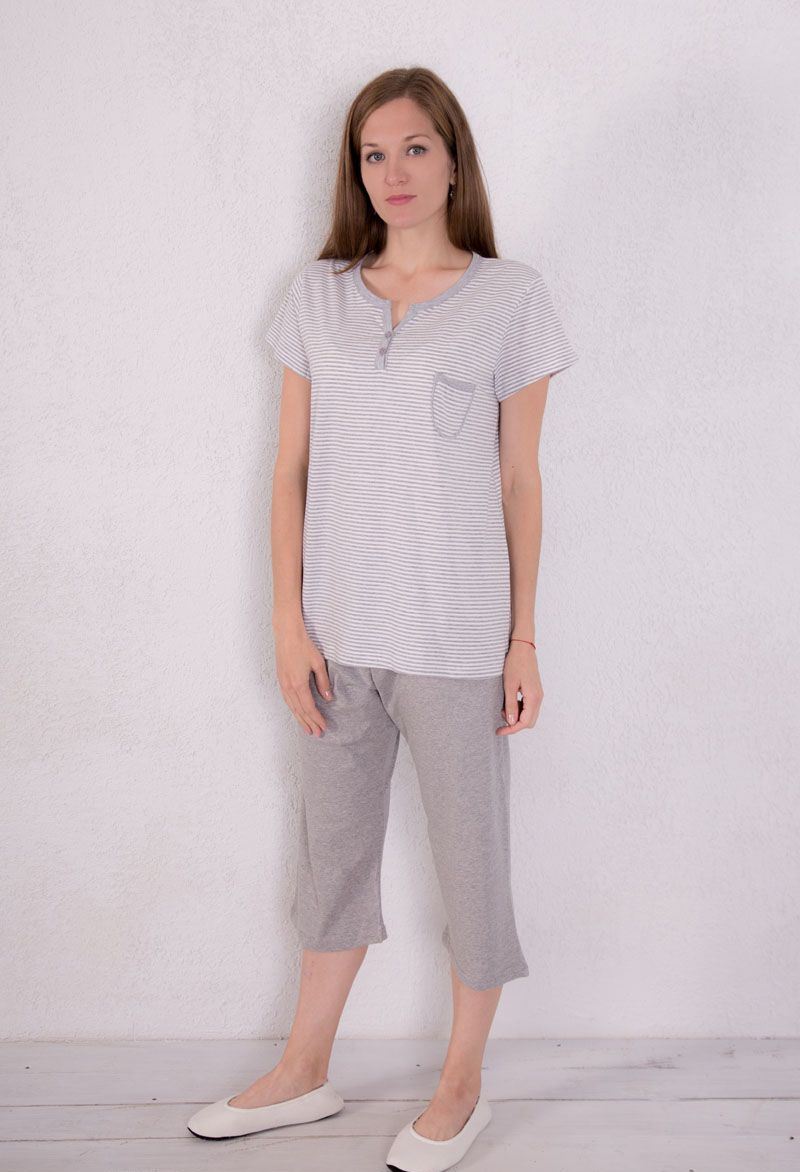 Удобный домашний комплект - футболка с коротким рукавом и капри на эластичном поясе с кулиской. Изделие из мягкого трикотажного полотна, отличный вариант на каждый день.