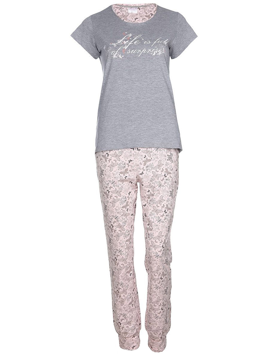 Женский домашний комплект Violett "Life is Full" включает в себя футболку и брюки. Комплект изготовлен из приятного на ощупь высококачественного натурального хлопка. Брюки дополнены широкой эластичной резинкой на поясе. Модель украшена принтом с изображением бабочек и цветов. Футболка с короткими рукавами и круглым вырезом горловины украшена надписью "Life Is Full Of Surprises".
