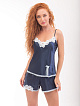 Комплект: топ на тонких бретелях и короткие шортики. Комплект выполен из однотонного шелкового полотна, бретели и низ топа, боковой шов шортов декорированы кружевом в цвет основной ткани.
