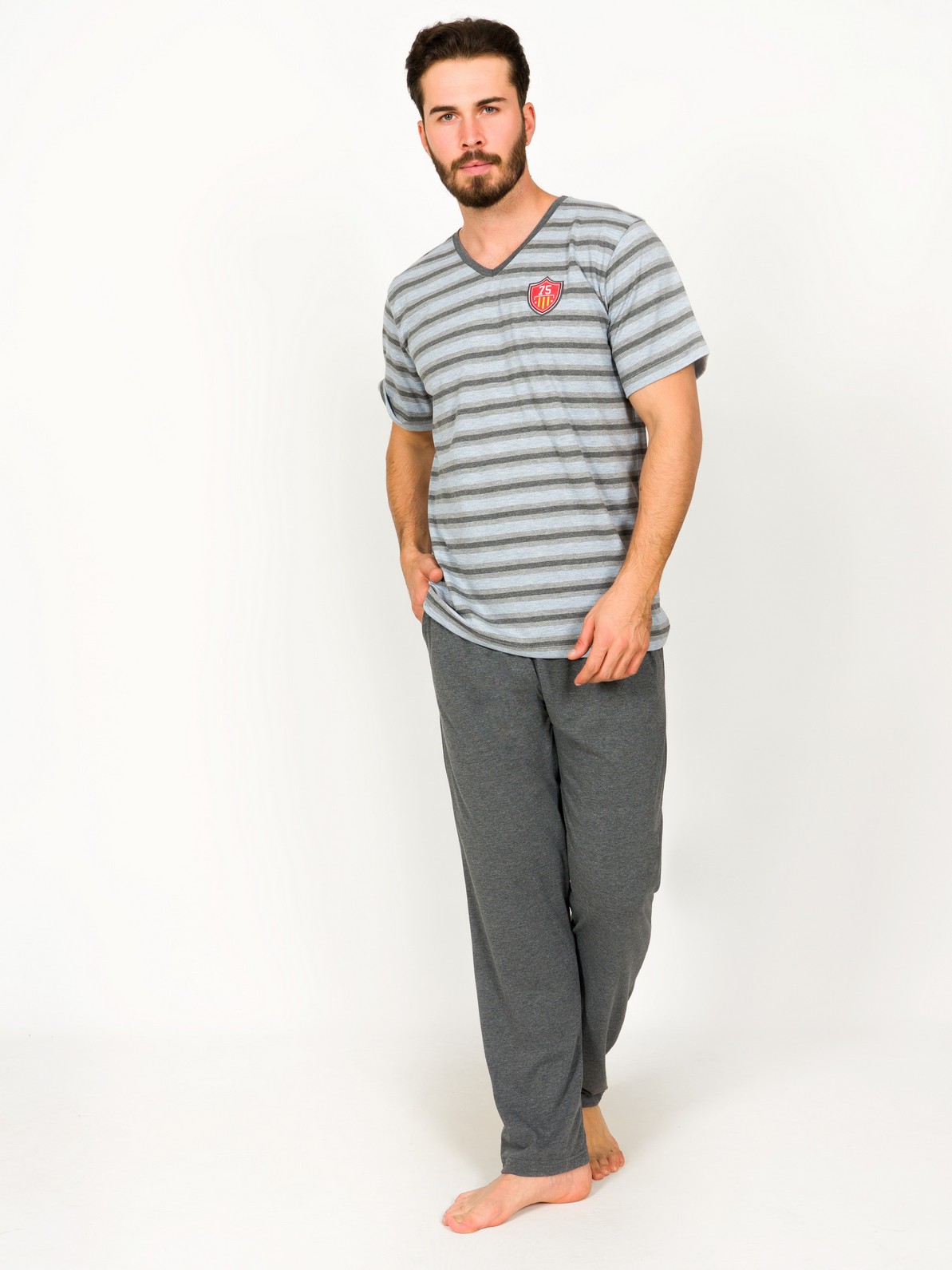 Мужской домашний комплект прямого кроя из качественной смесовой ткани (70% хлопок, 30% полиэстер) в стиле американского студенчества. Верх в горизонтальную полоску с V-образной горловиной, окантованной бейкой, и укороченным рукавом дополнен эмблемой на левой груди. Однотонные свободные брюки с карманами держатся на резинке. Ткань дышащая, легкая, износостойкая и маломнущаяся, а также легко стирается. Сделано в Турции.