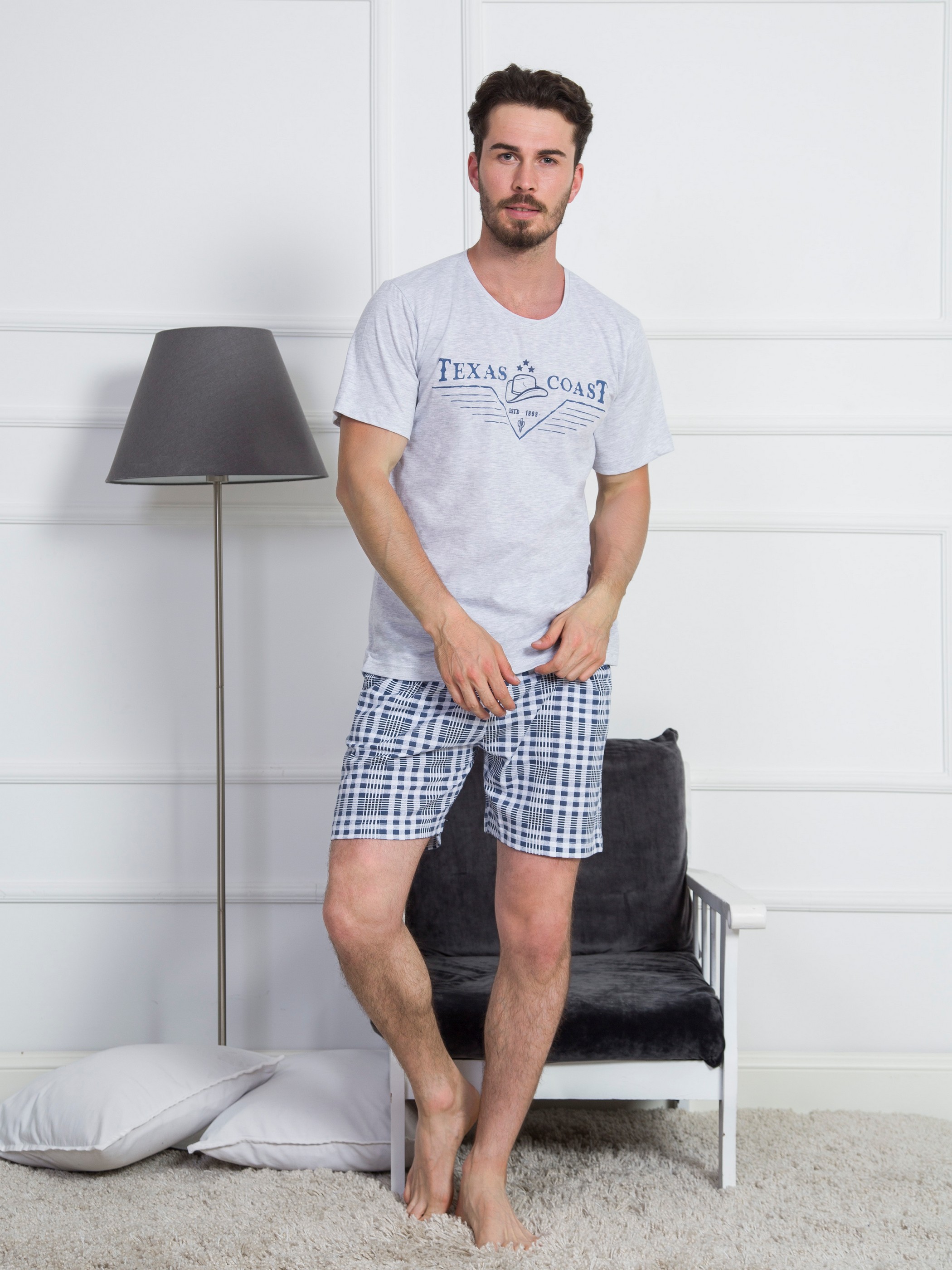 Удобный мужской домашний комплект прямого кроя в сером и синем цветах. Футболка с короткими рукавами и классической круглой горловиной, декорирована термоаппликация в верхней части груди. Шорты в клетку тартан с карманами на резинке и регулируемой завязке до колена. Качественная турецкая ткань, из которой сшит комплект, – дышащая, легкая, износостойкая и маломнущаяся. Не отжимать, не сдавать в химчистку, стирать при 30 градусах, гладить до 110 градусов, не отбеливать. Произведено в Турции.