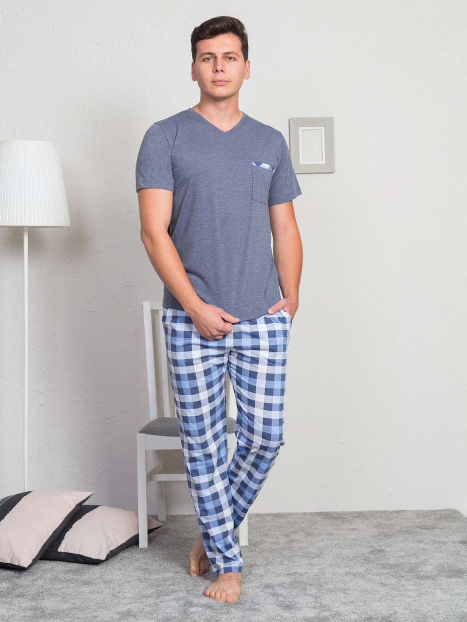 Мужской домашний комплект прямого кроя из качественной турецкой ткани (верх: 70% хлопок, 30% полиэстер; низ: 100% хлопок). Однотонный верх с V-образной горловиной и коротким рукавом дополнен кармашком на левой груди. Брюки с карманами в клетку тартан держатся на резинке, декорированной завязками. Ткань дышащая, легкая, износостойкая и маломнущаяся, а также легко стирается.
