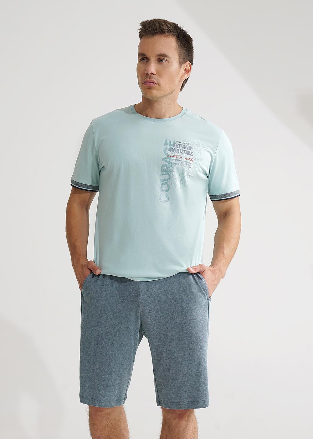 Комплект мужской для дома состоящий из футболки и шорт. Футболка из трикотажного полотна с круглым вырезом горловины, коротким рукавом с вязаными манжетами и стильным принтом. Шорты из пике на эластичном поясе с функциональными карманами и шнуром.