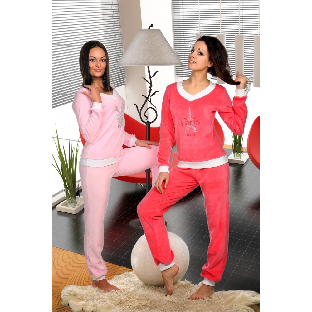 Костюм состоит из фуфайки и брюк.Фуфайка прямого силуэта, длиной чуть выше линии бёдра. Низ изделия на поясе. На детали переда термическая наклейка из пластиковых страз. Рукав втачной, длинный на манжете. V-образная горловина, манжета рукава и пояс выполнены из трикотажного полотна – кашкорсе (2х2).Брюки длинные, прямого силуэта. Низ брюк на манжете из кашкорсе.