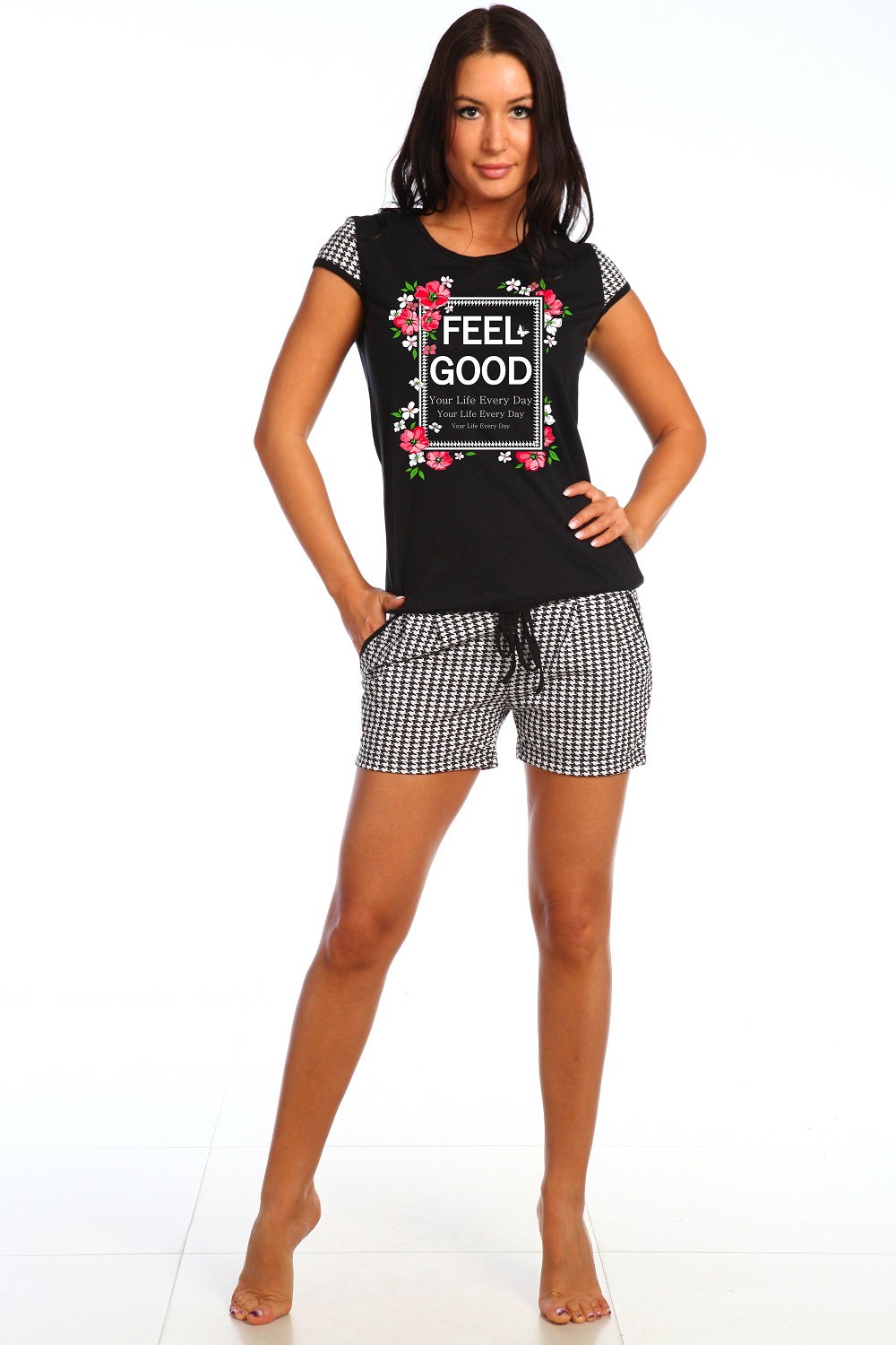 Костюм состоит из футболки с коротким рукавом и шорт в клетку.