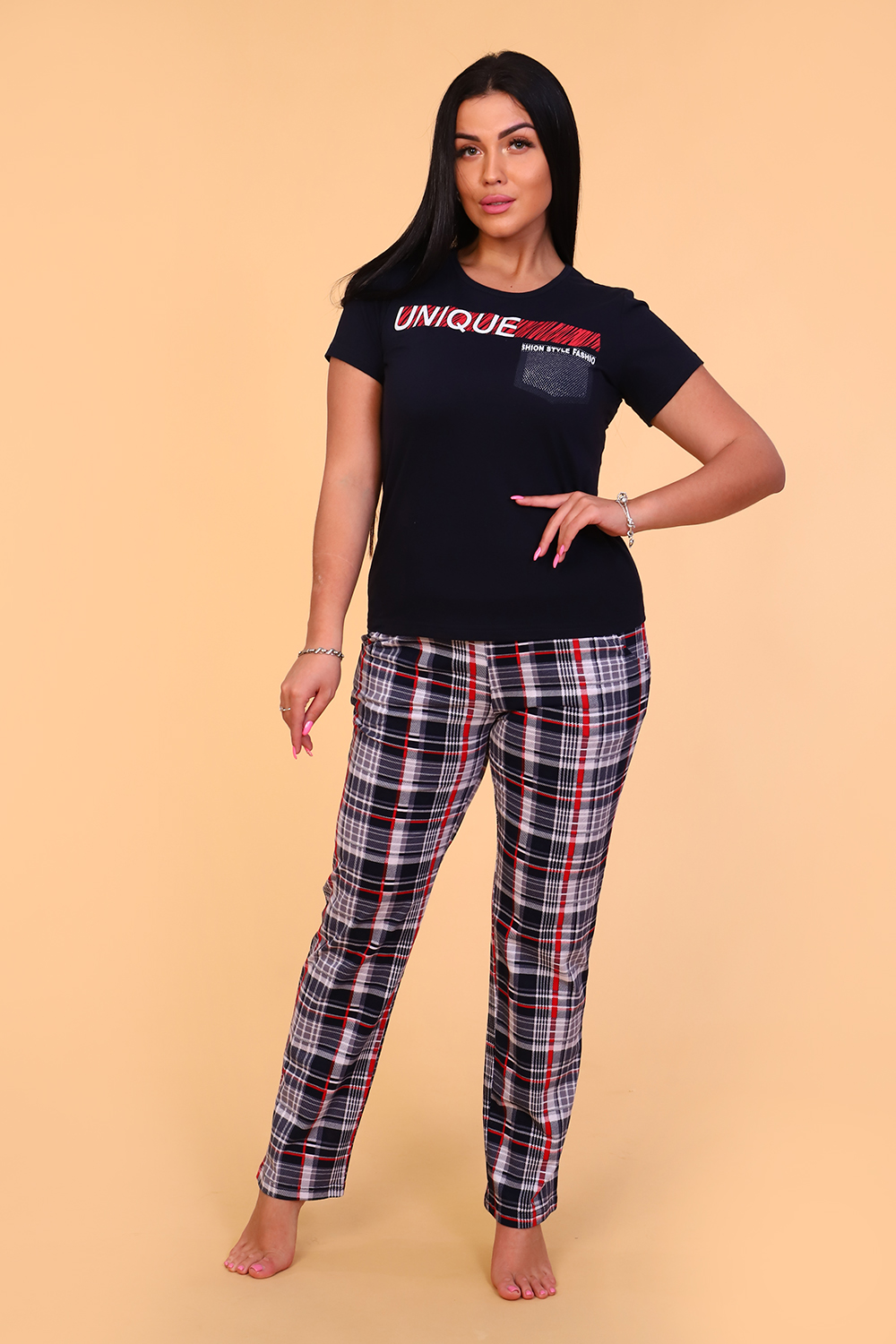 Красивый, уютный домашний костюм из футболки и брюк. Спереди на футболке оригинальный принт, больше удобства придадут карманы на брюках. В нашем костюме Вам будет удобно и комфортно отдыхать и заниматься домашними делами.