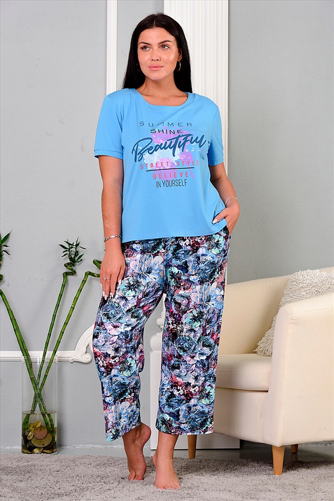 Костюм из вискозы в комплектации футболка + укороченные брюки свободного покроя. Эта модель для женщин любого возраста и самой разной комплектации.