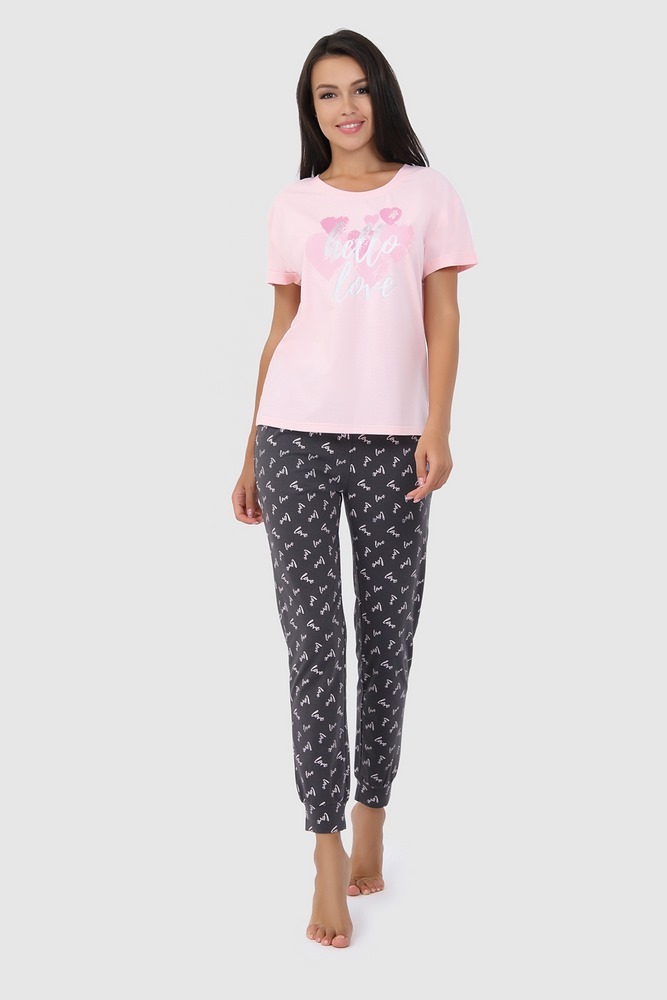 Очаровательный комплект для дома и отдыха, состоящий из футболки и брюк. Футболка свободного силуэта из хлопкового полотна с короткими рукавами и очаровательными разрезами в боковых швах. На полочке нежный локальный принт с глитером. Брюки с манжетами и мелким принтом "Love".
