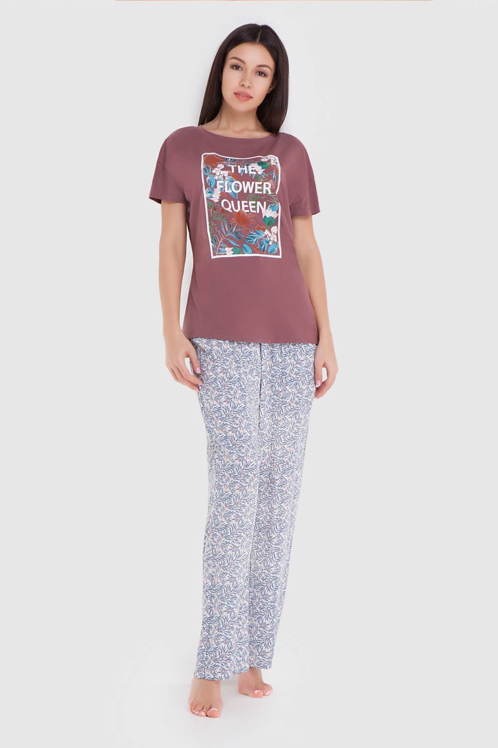 Очаровательный комплект для дома и отдыха, состоящий из футболки и брюк. Футболка полуприлегающего силуэта из смесового полотна оттенка мокко. Крупный травянистый принт на полочке создает гармоничный ансамбль с брюками. Брючки из текстильной вискозы свободного силуэта, на комфортной посадке.