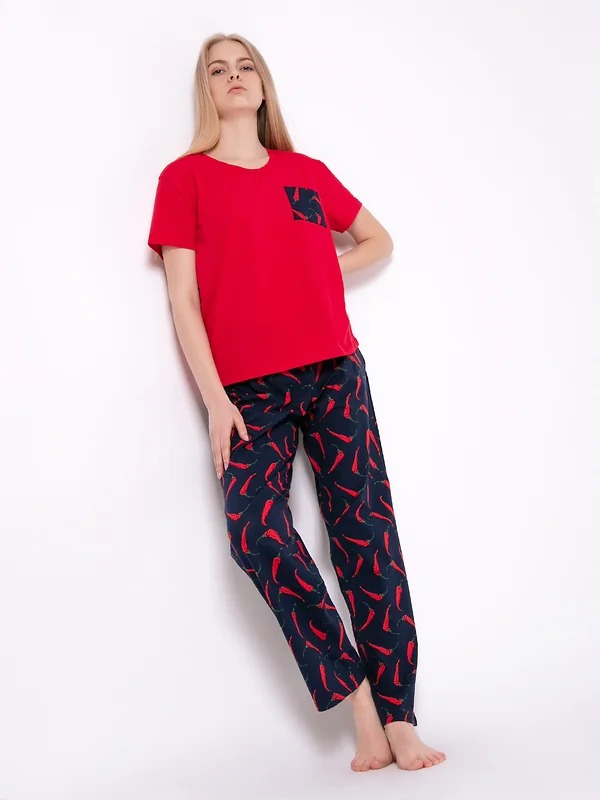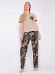 Домашний костюм. Футболка прямого силуэта с накладным карманом на полочке. Круглый вырез горловины. Короткий рукав с отворотом.Брюки свободного силуэта на резинке по талии. На брюках декоративный бантик.