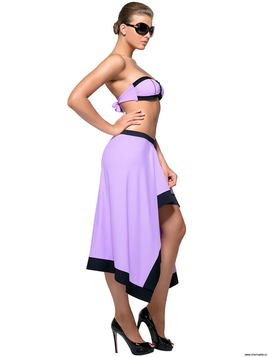 Изысканный пляжный трансформер. Юбка-сарафан ассиметричного кроя на широком поясе, декорированная по подолу широкой контрастной окантовкой. Модель выполнена в розово-сиреневом цвете и прекрасно дополняет любой купальник коллекции.