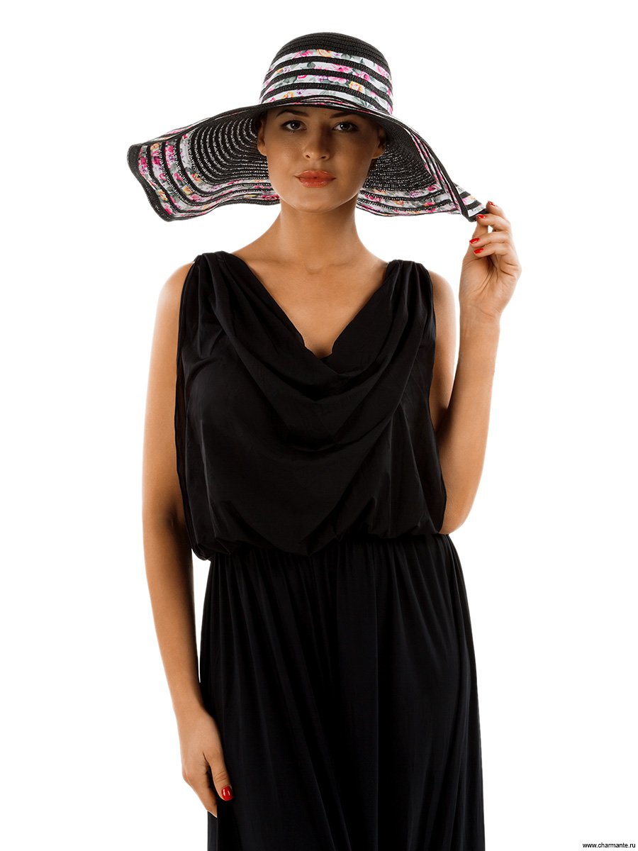 Женская шляпа, выполненная в комбинированной манере: из синтетического материала и хлопковой принтованной ткани. Плетеная структура изделия способствует свободной циркуляции воздуха. Гибкие широкие поля позволяют принять изделию форму по вашему желанию. Изделие украшено бантом.