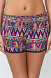 Пляжные шорты из принтованной ткани. Модель с поясом на эластичной резинке и контрастной окантовкой по низу изделия.