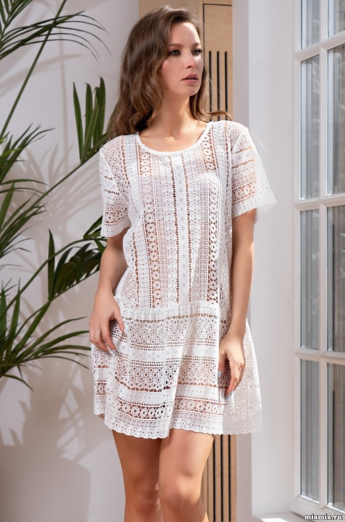 Туника Mia-Amore с круглым вырезом из хлопкового кружевного полотна с коротким рукавом. Низ обработан кружевной оборкой.