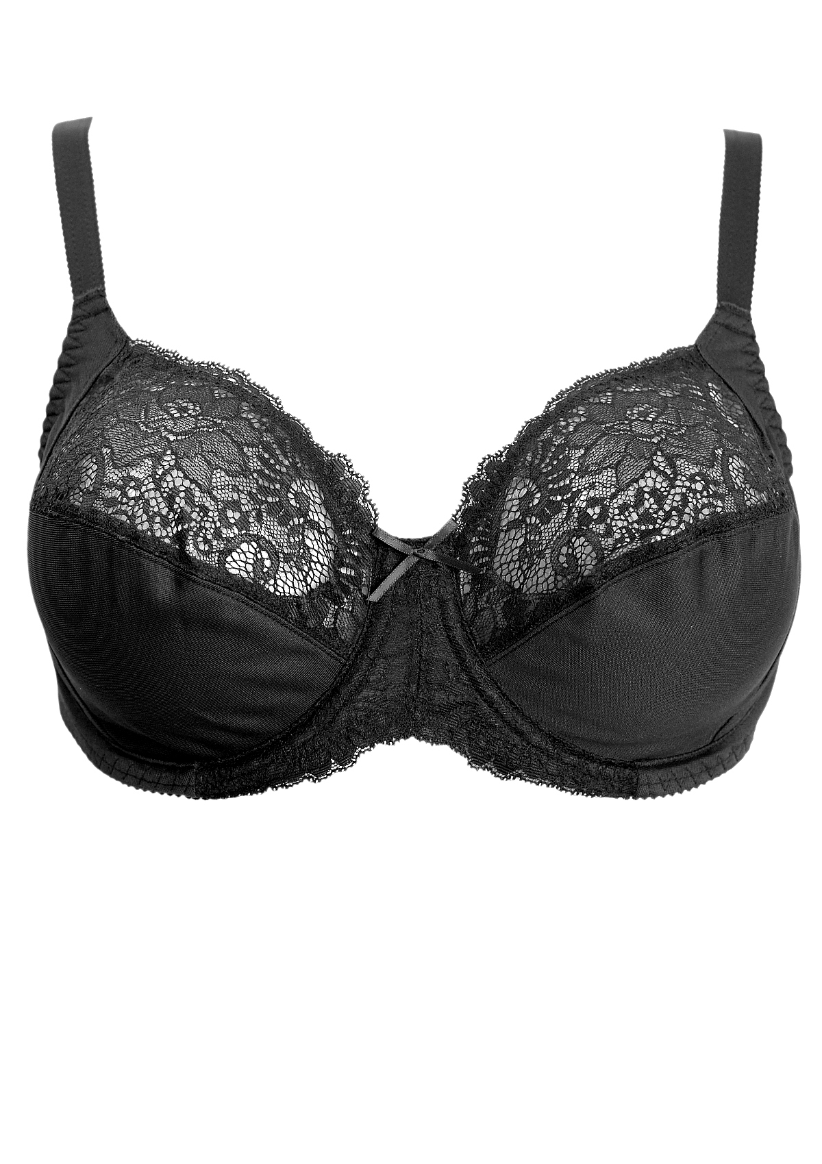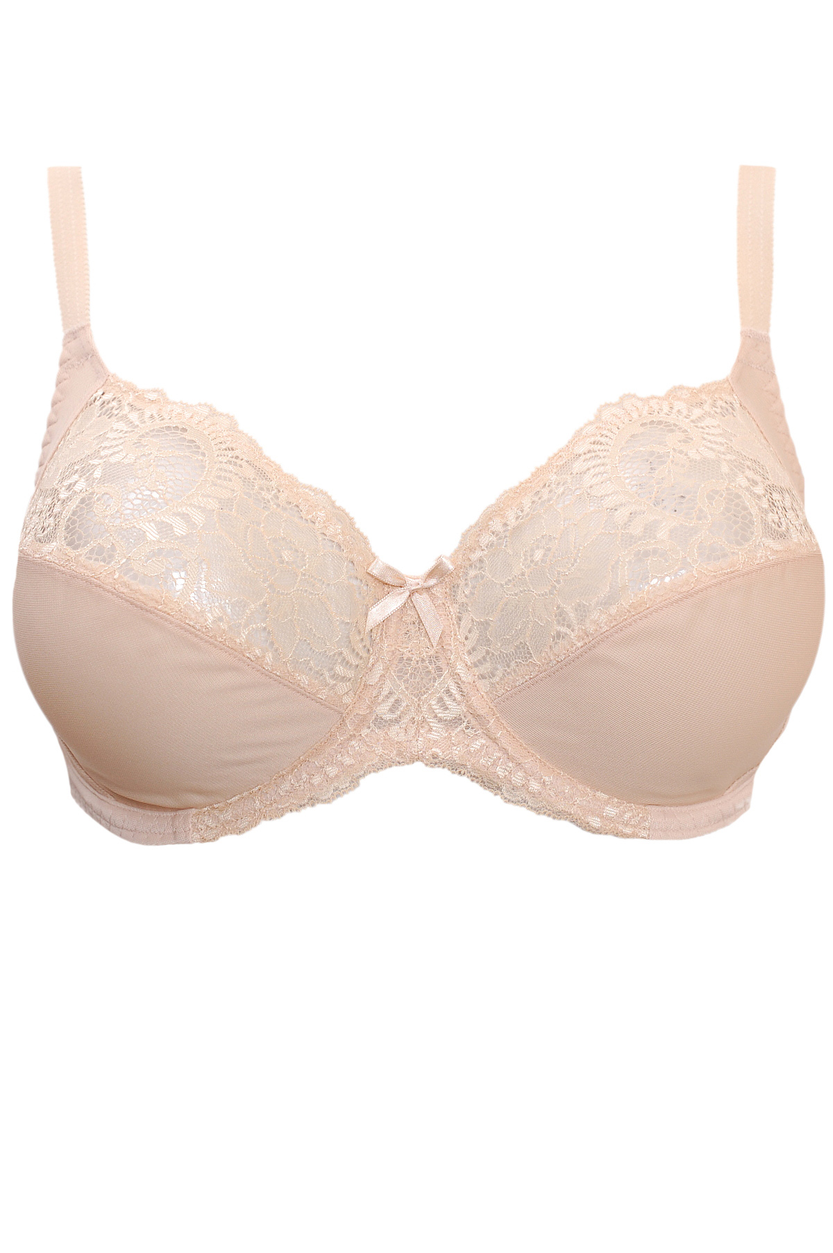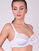 Бюстгальтер из неэластичного и эластичного трикотажного полотна и эластичного кружева. На каркасах. Мягкие чашки с двойным членением и боковой корректирующей деталью. Отделка – бантик.