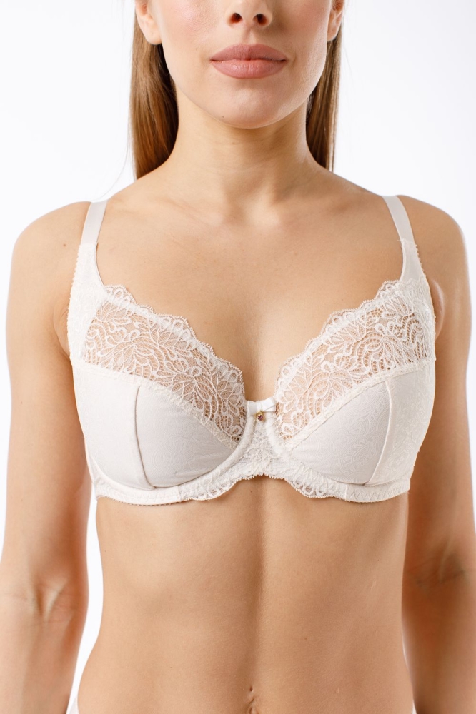 Бюстгальтер "мягкая чашка" на каркасах. Выполнен из эластичного кружева и эластичного принтованного полотна. Чашки бюстгальтера с внутренней боковой поддержкой, обеспещивающая прекрасную посадку и комфорт. Украшение бантик с камнем.