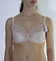 Бюстгальтер с мягками чашками с косточками, верх выполнен из тонкого, прозрачного кружева. В полнотах G и H кружево продублировано прозрачной сеткой. Низ и бочок чашки выполнен из неэластичной устойчивой ткани (33% хлопка). Для лучшей поддержки сбоку имеется прострочка.