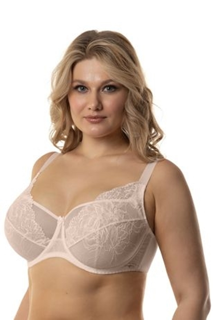 Бюстгальтер - балконет на каркасах с мягкой чашкой. Чашки оригинального конструктивного решения. Внутренняя чашка с вертикальным рельефом и вытачкой создаёт округлую форму. Лёгкая сетчатая структура использованного в ней материала позволяет коже дышать под изделием, обеспечивая наивысший комфорт при носке. Наружная чашка с диагональным членением из ажурного кружева украшает бюстгальтер и создаёт оказывает поддержку. Благодаря этому бюстгальтер надёжно и комфортно фиксирует грудь в нужном положении.