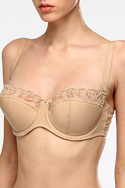 Бюстгальтер «балконет» из неэластичного трикотажного полотна, неэластичной вышивки и эластичного сетчатого полотна. На каркасах. Нижние детали чашек на дубляже с хлопком. Съемные бретели. Отделка – бантик.