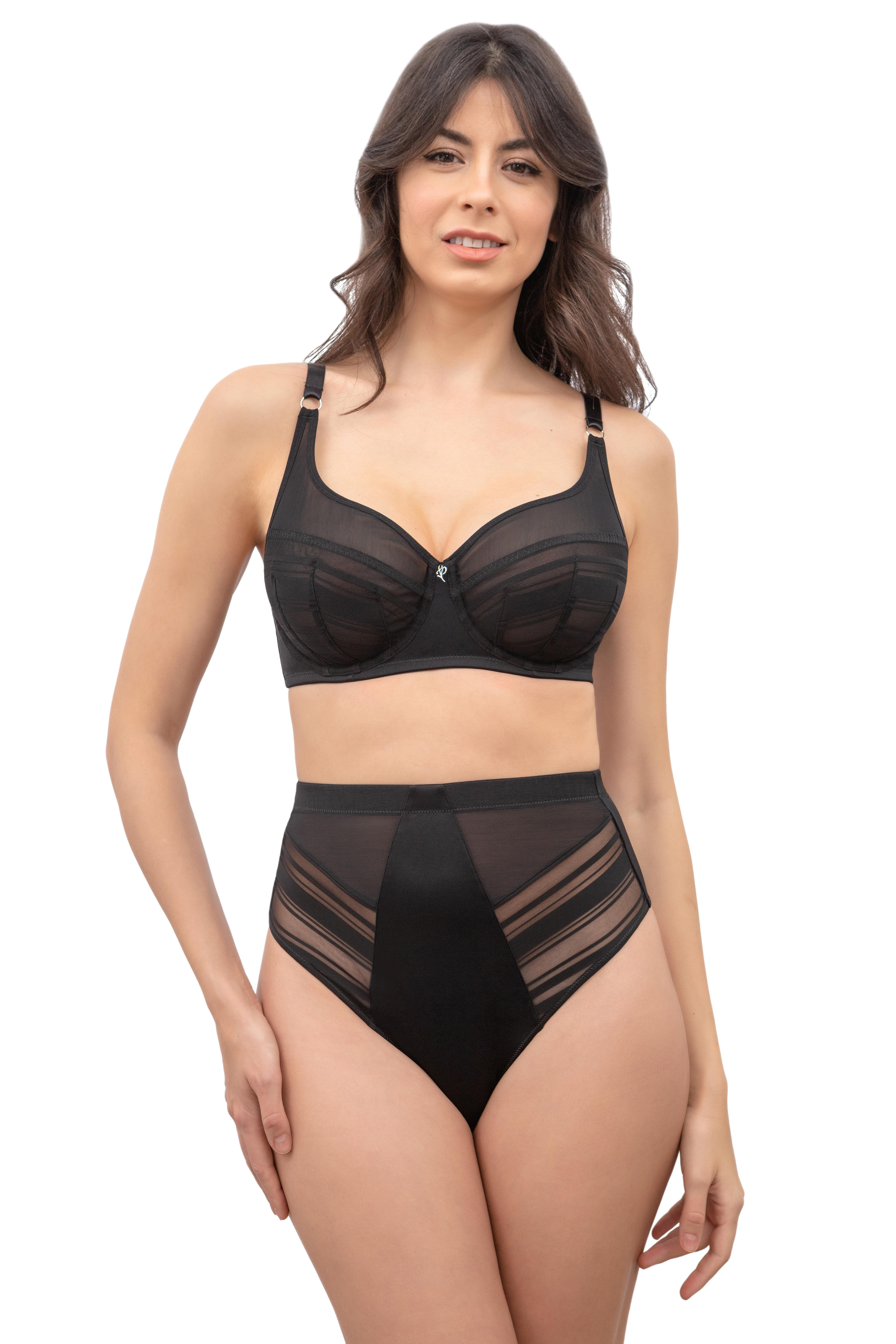 Бюстгальтер на стане, на каркасах. Мягкие чашки из эластичного кружева в полоску на подкладке из мягкого монокапрона, верхние детали чашек из эластичной сетки. Передняя и боковые детали стана из эластичного полотна укреплены монокапроном. В боковых швах упругие пластины. Стан сзади из эластичной сетки. Регулируемые бретели «anti-slip» сзади с декоративным V-элементом.Декор: хромированная фурнитура и бренд-подвеска.