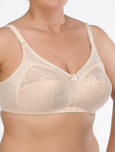 Бюстгальтер без каркасов, из эластичного полотна. Удобные широкие бретели и спинка из трикотажного полотна гарантируют надежную поддержку и комфорт. Чашки оформлены неэластичным кружевом, что придает бюстгальтеру более женственный и утонченный вид, а их нижняя часть дополнена подкладкой из хлопка для еще большего удобства. Широкая спинка, застежка на трех крючках.