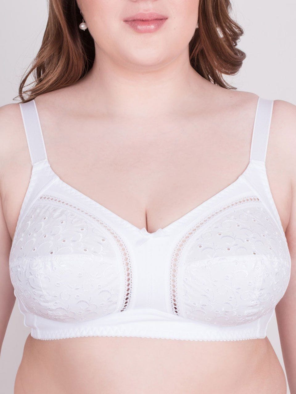 Бюстгальтер из вышитого тканого хлопкового полотна и эластичного трикотажного полотна с содержанием хлопка. Без каркасов. Чашки с боковой корректирующей деталью. Нижние детали чашек на подкладке из тканого хлопкового полотна. Отделка – шитье на тканом хлопковом полотне и бантик.