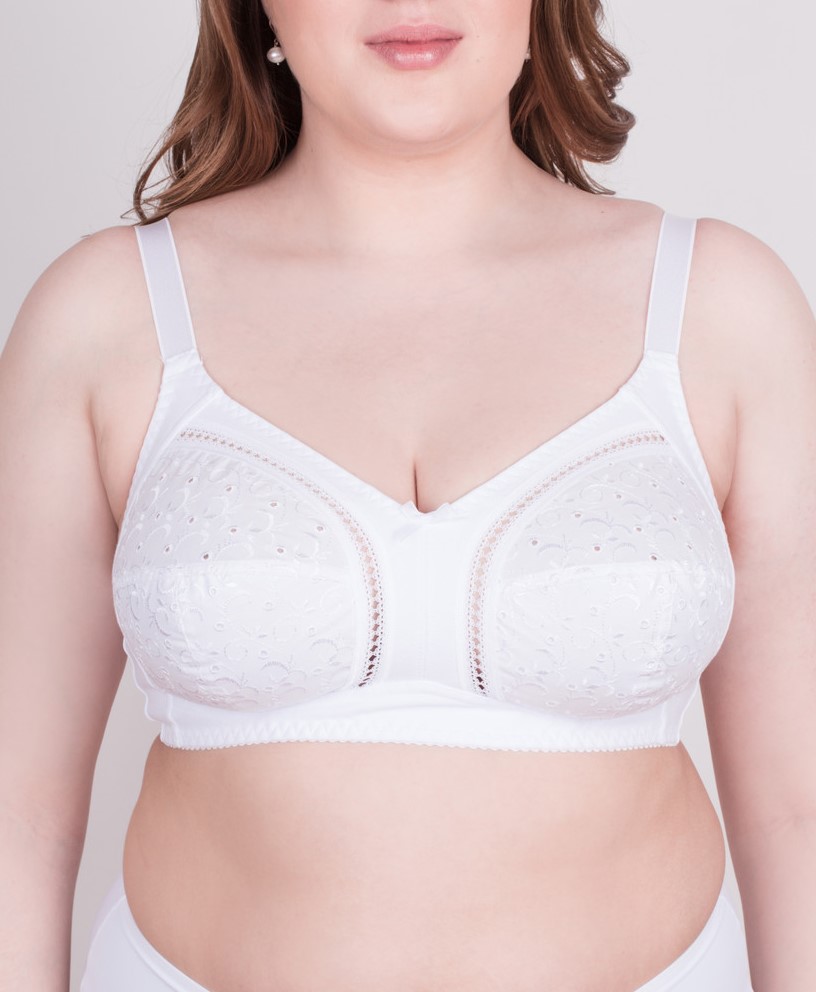 Бюстгальтер из вышитого тканого хлопкового полотна и эластичного трикотажного полотна с содержанием хлопка. Без каркасов. Чашки с боковой корректирующей деталью. Нижние детали чашек на подкладке из тканого хлопкового полотна. Отделка – шитье на тканом хлопковом полотне и бантик.