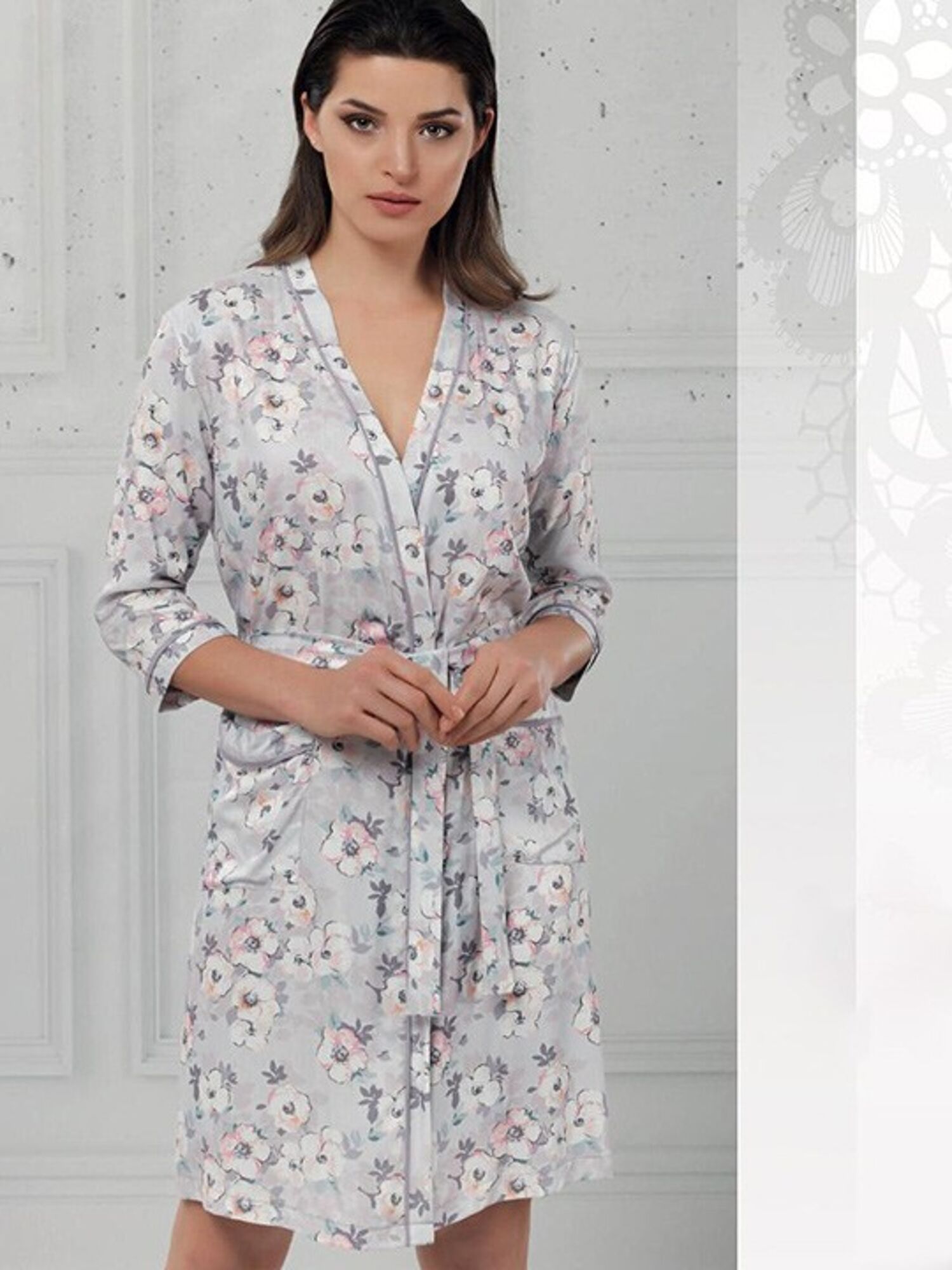 Пеньюар с длинным рукавом, на запах. Накладные карманы.