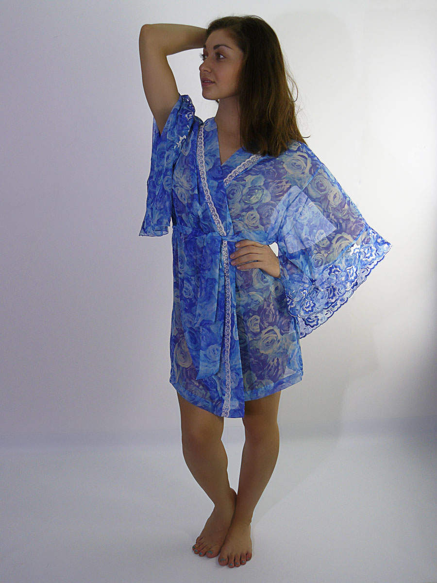 Короткий пенюар из тонкого, легкого, воздушного шифона. Свободный, летящий силуэт модели обеспечит комфорт.