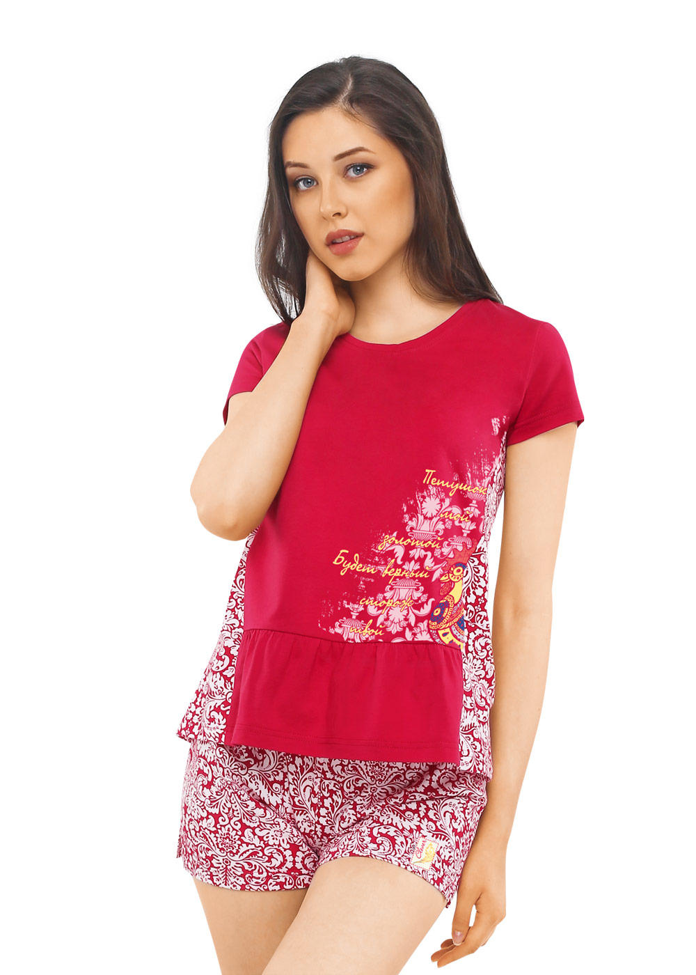 Пижама, состоящая из однотонной фуфайки с оригинальным принтом и шорт .