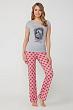 Пижама, состоящая из трикотажной футболки и брюк. Футболка с круглым вырезом горловины, декорированная контрастным принтом спереди. Брюки с эластичной резинкой на поясе, декорированы принтом.