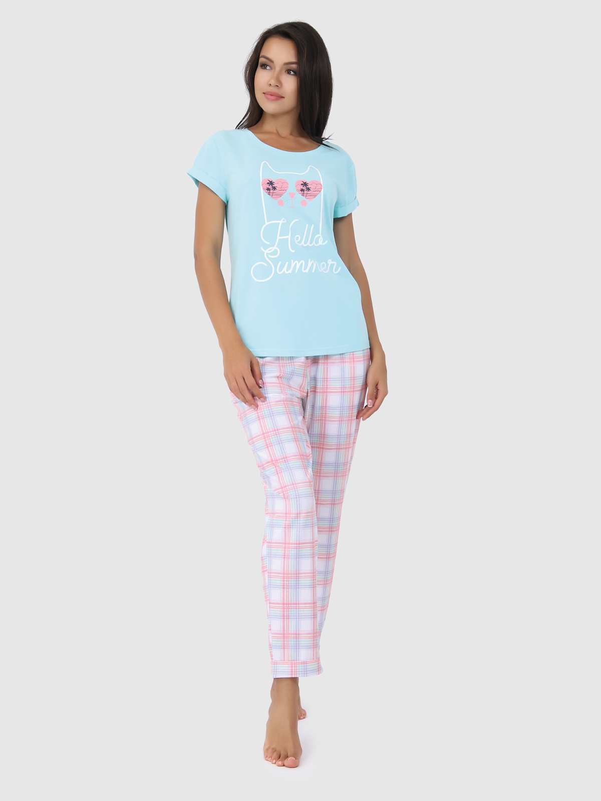 Нежная пижама, состоящий из футболки и брюк. Футболка прямого силуэта с короткими рукавами, на полочке веселый локальный принт. Брюки из принтованного полотна, слегка заужены к низу, с карманами.