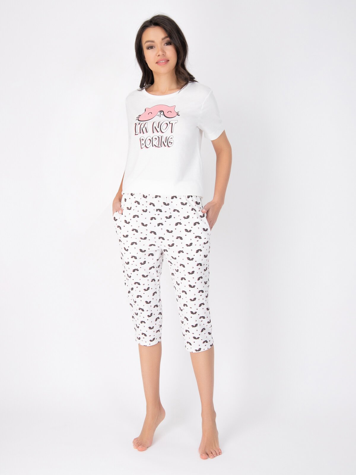 Комфортная пижама, состоящая из футболки и бриджей. Футболка прямого силуэта с планкой по низу и короткими рукавами. Бриджи прямого фасона, слегка заужены к низу. Модель декорирована мягким "кошачьим" принтом.