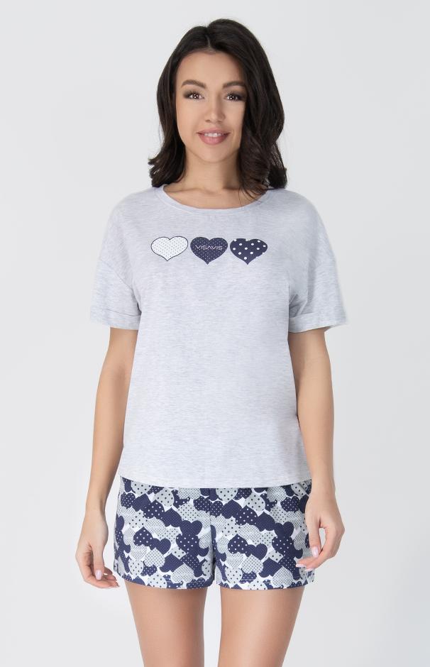Нежная пижама, состоящая из футболки и шорт. Футболка прямого силуэта выполнена из меланжевого полотна. На полочке принт "сердечки". Укороченные шорты комфортной ширины с контрастным принтом. Пояс с резинкой, дублируется шнурком.