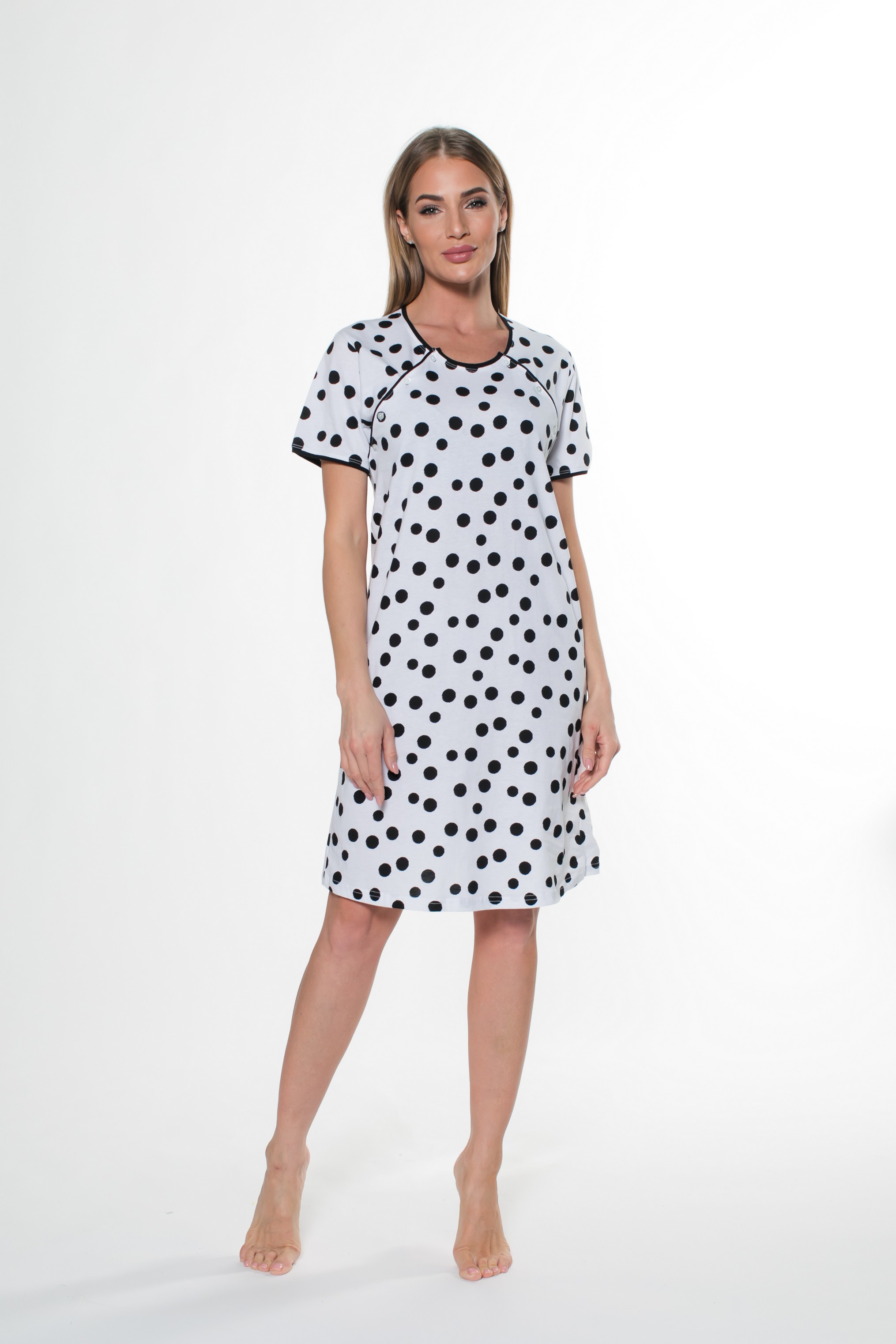 Туника для кормящих мам в крупный горох прямого кроя из премиального турецкого хлопка. Модель дополнена классической круглой горловиной и коротким рукавом, подол ниспадает до колен. Рукава, горло и кармашки для кормления окантованы бейкой. Хлопковая ткань прочная, дышащая, мягкая, хорошо впитывает влагу, как и любой натуральный материал восприимчива к свету, хорошо проглаживается.