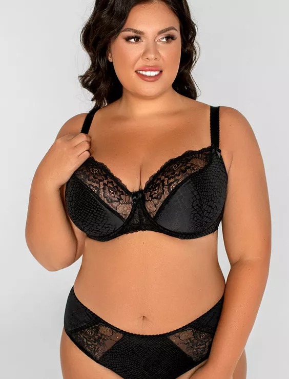 Комбинированная чашка из эластичного кружева и эластичного принтованного полотна. Низ чашки дублирован поролоном. На каркасах. Боковые детали усилены стержнями.
