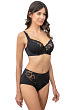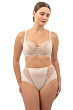 Бюстгальтер с полудублированными чашками, на стане, на каркасах. Чашки с тройным диагональным членением. Верхний край чашки из вышивки усилен эластичной тесьмой, нижние детали из эластичного полотна на дубляже. Центральная и боковые детали стана усилены монокапроном, в боковых швах – упругие пластины. Ажурные регулируемые бретели, спереди украшены вышивкой. Декор – атласный бант.