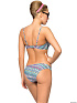 Стильная пляжная двойка. Бюст — мягкие чашки на каркасной поддержке с регулировкой объёма по верхней линии декольте тонким шнурком-спагетти. Изящные плоские бретели удобно регулируются по высоте, а бюст фиксируется на фигуре фирменной застёжкой. Глубокие плавки комфортной посадки с регулировкой ширины по передней детали. Купальник выполнен в технике поместного расположения рисунка.