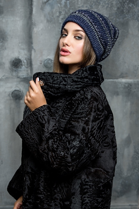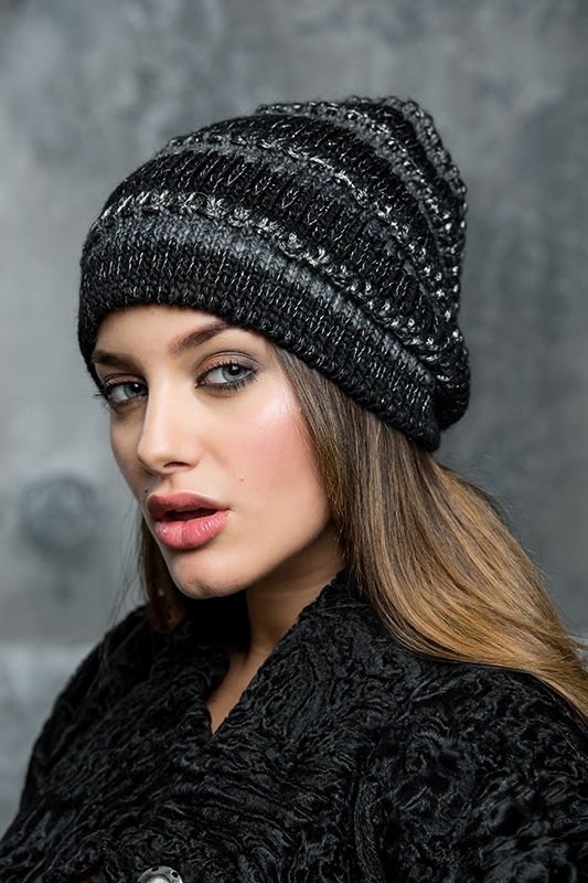 Шапка удлиненной формы с фиксированными защипами сзади. Модель на флисовой подкладке. Использованы различные сочетания разных видов пряжи.