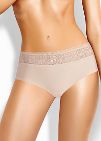 Шорты комфортной посадки. Изделие имеет комбинированные с кружевом отрезной бочок и деталь спинки. По талии выполнена обработка резинкой с фестоном. Завершает дизайн небольшой атласный бант на детали переда.