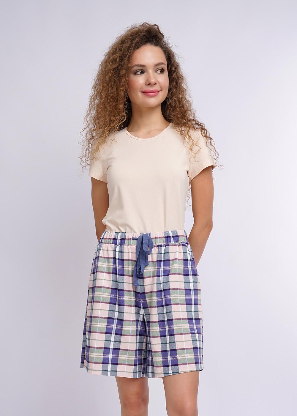 Шорты среднего объёма из хлопкового полотна в клетку. Модель с карманами в швах, в отрезной пояс вставлен кипер.