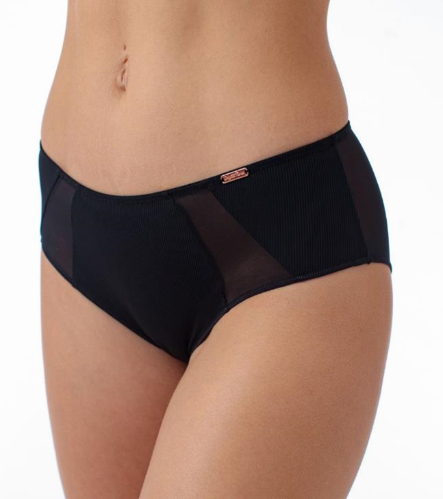 Трусы-панти со средней линией талии, выполнены из матовой шелковистой микрофибры в рубчик. Задняя часть выполнена из эластичной сетки. Плоские швы. Украшение: медальон COQUETTE REVUE.