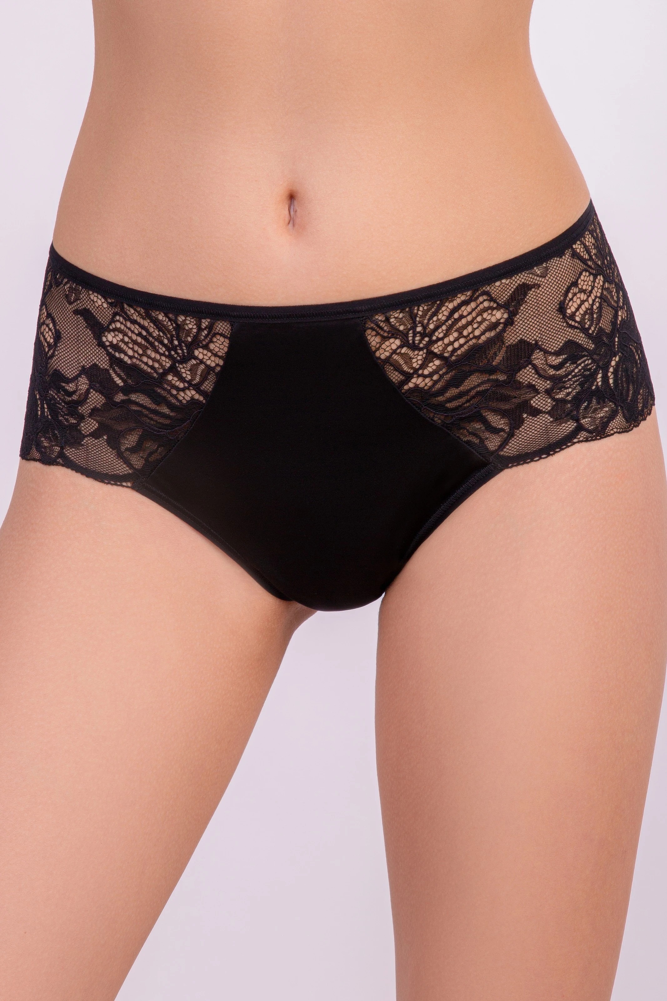 Трусы брифы со средней линией талии. Выполнены из итальянского ажурного кружева с нитью «кардоне» и эластичного трикотажного полотна.