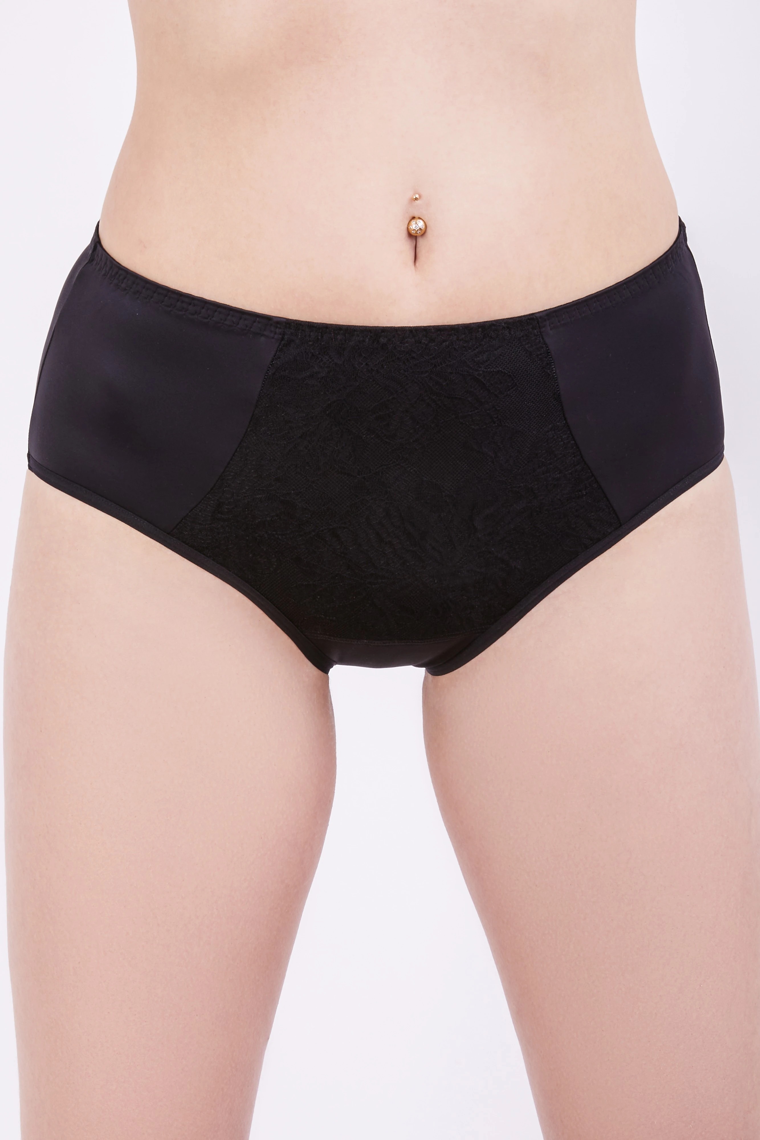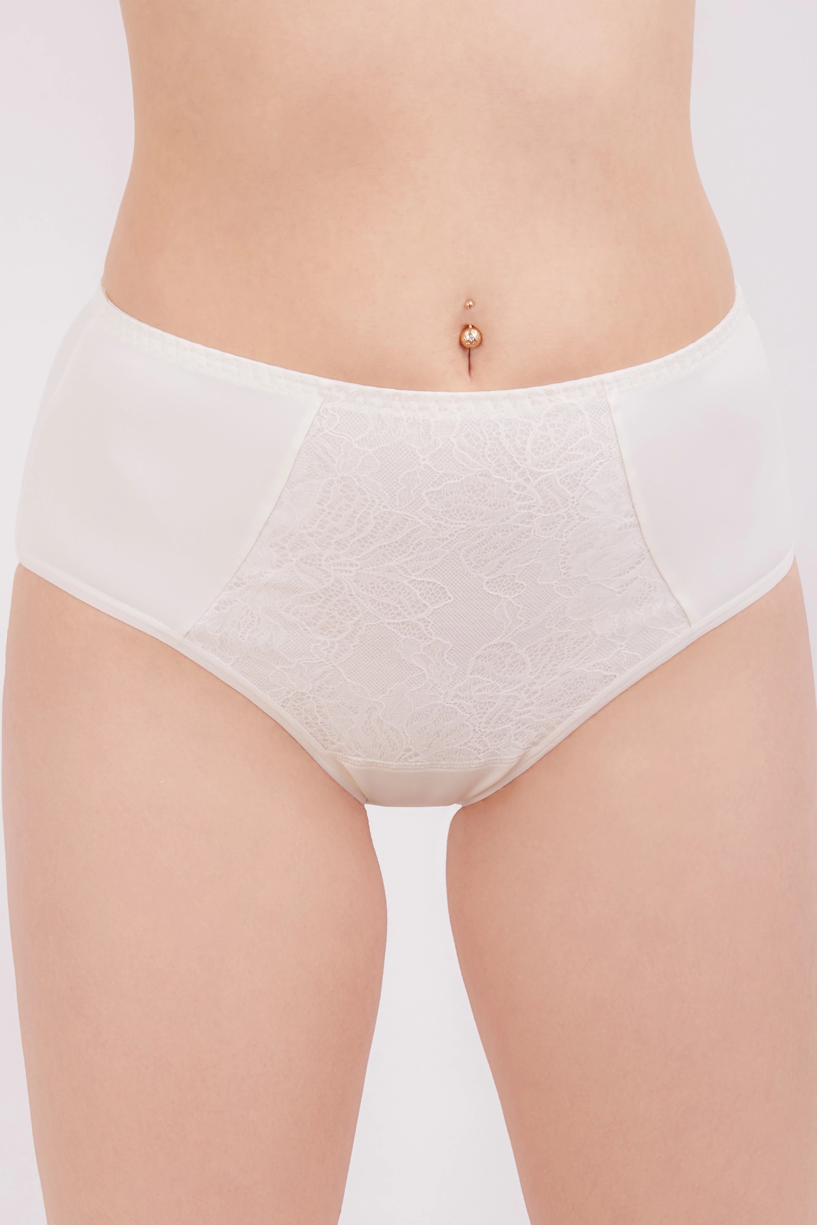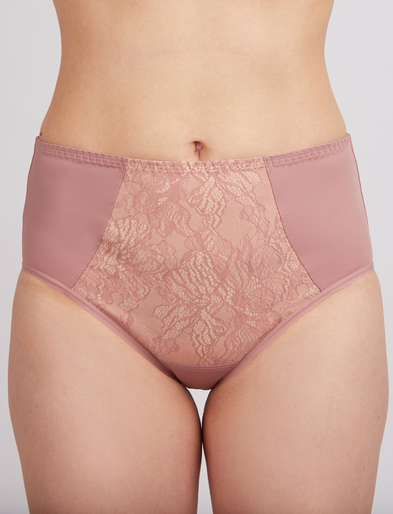 Женские трусы слип с высокой линией талией. Выполнены из эластичного полотна. На передней детали вставка из кружевного полотна ламинирована хлопком. Ластовица хлопковая. Нижние срезы о линии проймы обработаны плоским швом.